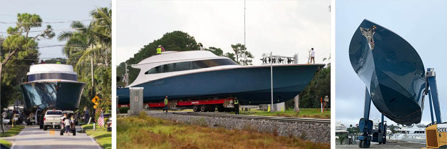 Late last month, Ovation, a 100’ Jim Smith Tournament Boat made a two-mile trek over land from the manufacturer to the Hinckley Yacht Services yard in Stuart, Florida where she made her first splash. This highly orchestrated task took nearly five hours and required over 100 people to move the behemoth to Hinckley where she was picked up by the 150-ton Travelift and launched by the Hinckley Yacht Services crew.
