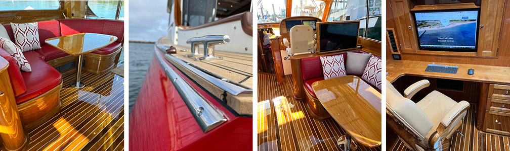Mike McVean, owner of Sunshine, a Hinckley Talaria 48 MKII, has a penchant for red. Whether piloting a jet, driving his Jeep through Dallas, or navigating open water, his vehicle of choice is finished in masculine pops of color. So, when he placed the order for Sunshine and collaborated with Newport Yacht Interiors on color palettes and fabric selections, naturally, red anchored the interior design inspiration. The result? A boat as stylish as it is powerful — Sunshine, like its captain, is sophisticated yet poised for play.