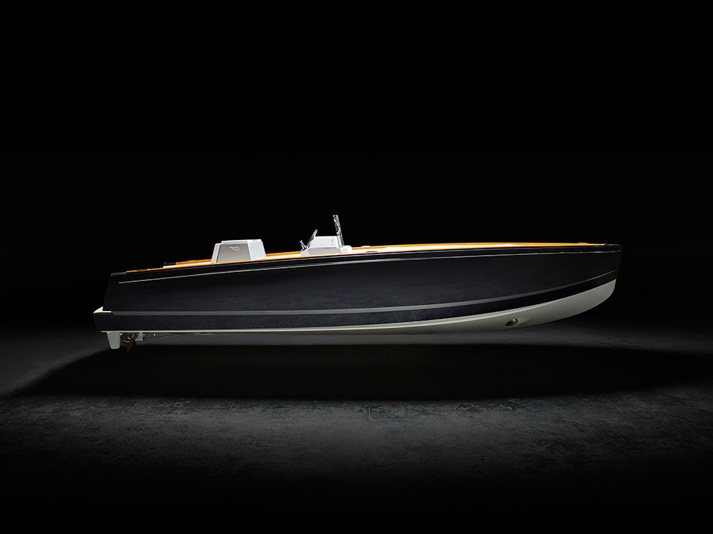 Dasher, borrowing her name from the game-changing, original Picnic Boat hull #1, sports a carbon-epoxy composite hull shape designed by Michael Peters to provide superior performance and handling. With hand-painted, lightweight composite Artisanal Teak, every ounce of weight has been shaved and sculpted.  Titanium hardware and console details were both 3D printed to achieve shapes and a level of precision unavailable in typical construction methods.  Dasher powers her 28 feet 6 inches with twin 80hp electric motors and dual BMW i3 lithium ion batteries.  “The Hinckley Whisper Drive silent propulsion system combines the latest hydrodynamics, electric power and digital control systems to achieve the performance handling and maneuverability that discerning clients will expect,” said O’Connell.