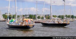 The boats participating in this weekend’s race started at the Eastport Yacht Club in Annapolis, Maryland and ended at the Chesapeake Bay Maritime Museum, now celebrating its 50th anniversary. Of the thirteen boats that participated in the race, 7 were Hinckley Yachts! Richard and Eileen Rosenthal came in first on their Bermuda 40 MK III sloop Someday, followed by Mariana and Pete Lesher in second place on Esperanza, a 1963 Custom Yawl. Multiple Hinckley Yachts have sailed in this event in the past and we’re sure they will continue to for as long as the race is run.