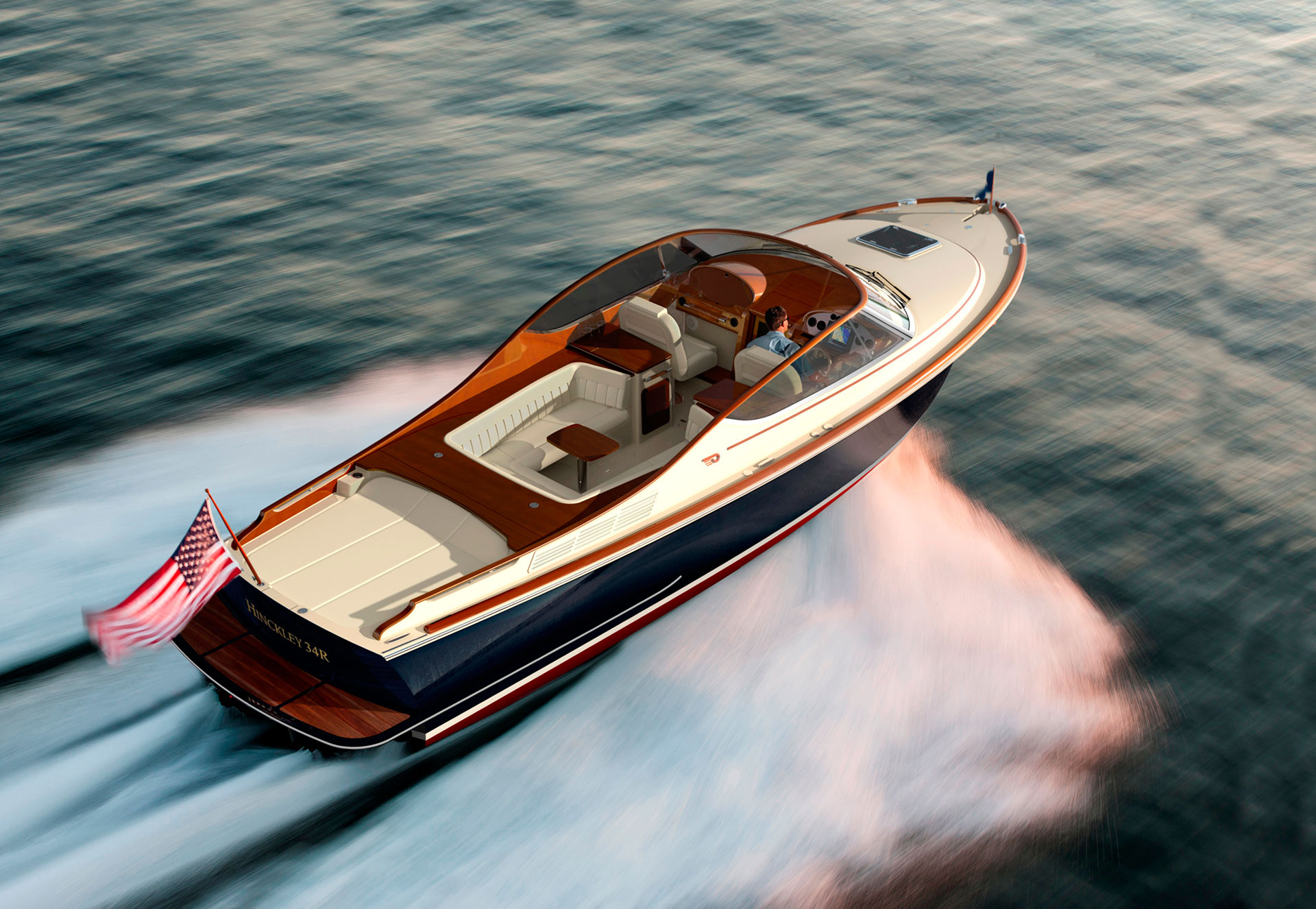 Venture through the companionway on the 34R to stash belongings, take a rest room break or shower and change into dry clothes after a day of salty fun. The interior offers headroom that’s surprising and enough space and seating to escape a summer storm. To finish the classic runabout, there is a long sunpad for two astern with a boarding door and walkway on centerline for boarding convenience. Should you have enough of the sun or the admiring looks, Hinckley has you covered: press a button to raise the power bimini roof into place to shade the cockpit fully.